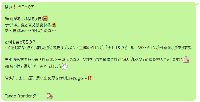 はいダニーです! 18日のレッスンは要望頂いたミロンガ曲をテーマにやりました。ミロンガ曲はどちらかと言えば男性が苦手意 識を持ってる方が多いように思えます。一方、女性はミロンガ曲を踊りたいと思っている方が多いですね。 Tango Frontier でレッスンに参加された男性から「ミロンガ曲を楽しめる様になれた」とお聴きしました。ダ ニーもはじめて知った事や直すポイントを教わりました。レッスンが良いキッカケになって良かったです。 以上が6月レッスン、ダニーの所感でした。 これで終わりじゃなくて 続けてお知らせです♪♪♪ ひとつ目は 来月のレッスンについてです。次回は7/16。「こんな事が上手く出来るようになりたい」と言う事が有ればダ ニー宛に直LINEか直メールを下さい。 二つ目は 9/17ミロンガのフライヤーが出来上がりました。9/17は今からスケジュール帳に入れておいて下さいね。 楽しみにしていて下さい! 以上、ダニーからのお知らせでした ![]() 「新潟にアルゼンチンタンゴを!」 それには 「楽しいタンゴが一番」 |